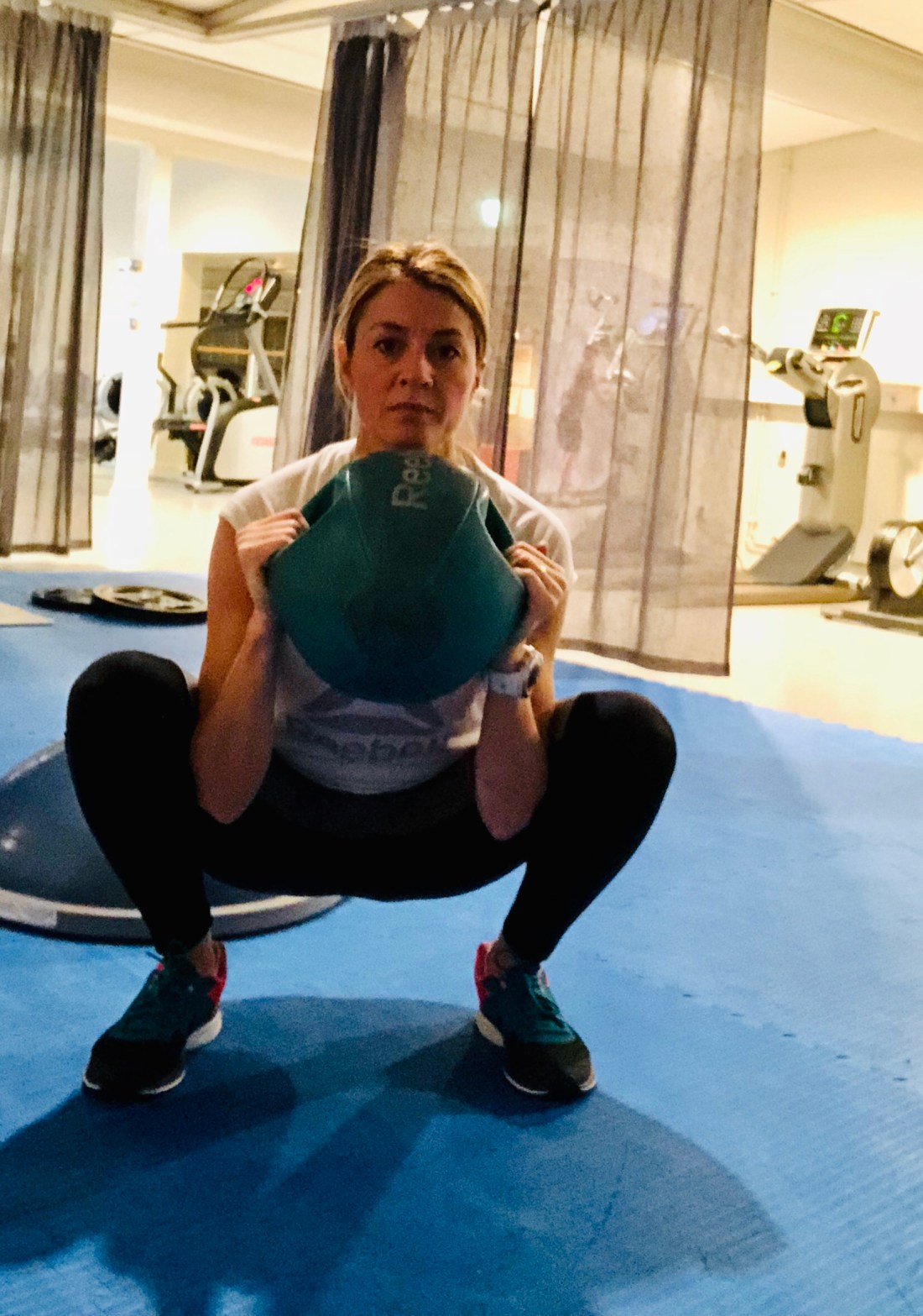 10 st/ben Bulgarian Split Squat – ställ dig höftbrett med fötterna en bit framför en pilatesboll. Håll vikten mot bröstet. Lyft upp en fot och placera den på bollen bakom dig. Böj främre knä och sjunk ner mot golvet samtidigt som du håller överkroppen rak. Spänn musklerna i främre ben och rumpa för att trycka dig upp i startpositionen. Gör ytterligare 9 repetitioner och sen samma sak med andra benet på bollen.